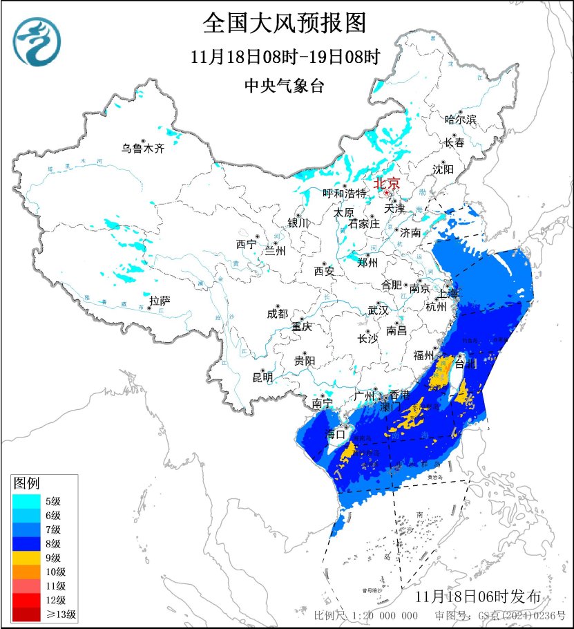 内蒙古中部、西藏北部、河北北部、河南西部、江苏南部、广西东南部沿海、广东南部沿海等地部分地区有5~6级风,阵风7级;黄海南部海域、东海大部海域、台湾海峡、台湾以东洋面、巴士海峡、南海北部和中部海域、北部湾将有7~8级、阵风9~10级的大风,其中东海南部部分海域、台湾海峡、巴士海峡、南海东北部部分海域风力可达9级、阵风10~11级(见图3)。中央气象台11月18日06时继续发布寒潮和大风蓝色预警。