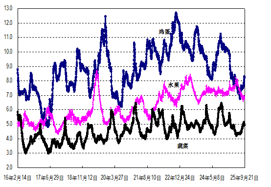 2. 蔬菜均价止涨回落。重点监测的28种蔬菜周均价每公斤4.97元,环比跌2.4%,同比低21.0%。分品种看,19种蔬菜价格下跌,3种持平,6种上涨。其中,黄瓜和菠菜价格跌幅较大,环比分别跌13.1%和11.8%,油菜和生菜价格环比分别跌6.5%和5.2%,其余品种价格跌幅在5%以内;冬瓜、蒜苔和芹菜价格环比均基本持平;青椒、莴笋、洋白菜、西红柿、大蒜和香菇价格环比分别涨6.2%、2.0%、1.3%、0.4%、0.3%和0.1%。