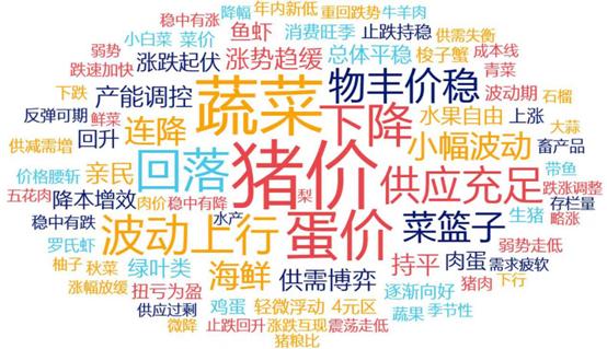 1.牛羊肉和鸡蛋价格继续上涨,猪肉价格继续下跌。猪肉批发市场周均价每公斤19.54元,环比跌0.8%,同比低27.3%;牛肉批发市场周均价每公斤65.55元,环比涨0.1%,同比高6.5%;羊肉批发市场周均价每公斤61.05元,环比涨0.2%,同比高3.1%;白条鸡批发市场周均价每公斤17.47元,环比跌0.1%,同比低1.6%。鸡蛋批发市场周均价每公斤8.19元,环比涨4.2%,同比低25.8%。