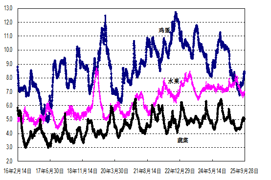 2. 蔬菜均价小幅上涨。重点监测的28种蔬菜周均价每公斤5.03元,环比涨1.2%,同比低21.3%。分品种看,20种蔬菜价格上涨,1种持平,7种下跌。其中,莴笋和青椒价格涨幅较大,环比分别涨12.1%和10.6%,西葫芦和冬瓜价格环比分别涨5.6%和5.2%,其余品种价格涨幅在5%以内;大白菜价格环比基本持平;菠菜、生菜、油菜、莲藕、大葱、胡萝卜和生姜价格环比分别跌10.1%、1.7%、1.6%、1.5%、1.0%、0.4%和0.1%。