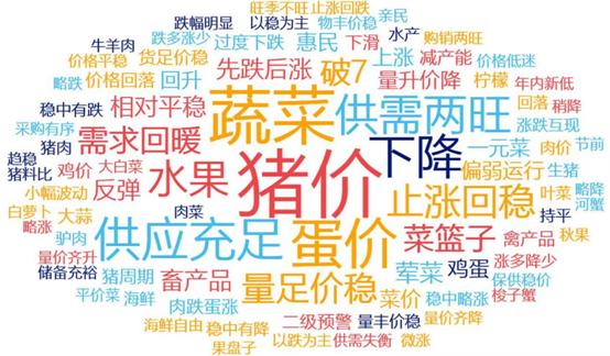1.牛羊肉和鸡蛋价格持续上涨,猪肉价格连续下跌。猪肉批发市场周均价每公斤19.31元,环比跌1.2%,已连续3周小幅下跌,累计跌幅2.3%,同比低25.9%;牛肉批发市场周均价每公斤65.97元,环比涨0.6%,已连续9周小幅上涨,累计涨幅3.5%,同比高7.1%;羊肉批发市场周均价每公斤61.81元,环比涨1.2%,已连续7周小幅上涨,累计涨幅3.8%,同比高4.9%;白条鸡批发市场周均价每公斤17.63元,环比涨0.9%,同比低1.5%。鸡蛋批发市场周均价每公斤8.40元,环比涨2.6%,已连续4周小幅上涨,累计涨幅10.8%,同比低21.4%。